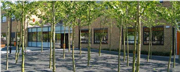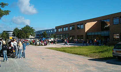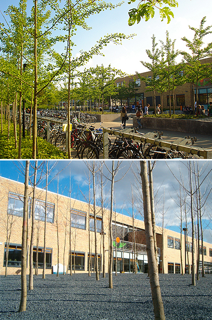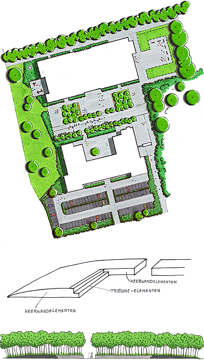 Het Groenhorst College in Ede heeft in 2006 een prachtig nieuw schoolgebouw in gebruik genomen. Pas toen het gebouw al was opgeleverd, werd SCHOOLPLEINONTWERPERS.COM betrokken voor de inrichting van het schoolplein. Er was toen al een basisinrichting gerealiseerd die bestond uit grijze tegels en een reeks fietsenrekken. In het plein waren verder nog een tweetal uitsparingen gemaakt voor groen, waarin het onkruid welig tierde...